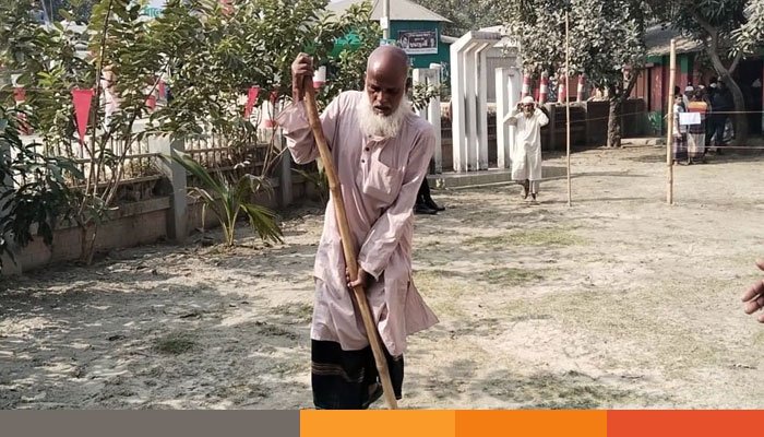 ভোট কেন্দ্রের পথে প্রতিটি ধাপ যেন কষ্টের গল্প। এক পা নেই, শরীর ক্লান্ত, বয়স ৭৫। তবু থামেননি আব্দুর সবুর মিয়া। লাঠিতে ভর করে তিনি এসেছেন শুধু একটি কারণে, ভোটাধিকার প্রয়োগের জন্য। কারণ তার কাছে ভোট মানে কাগজে সিল নয়, ভোট মানে জীবনের শেষ প্রান্তে দাঁড়িয়ে নিজের অস্তিত্বের স্বীকৃতি।
