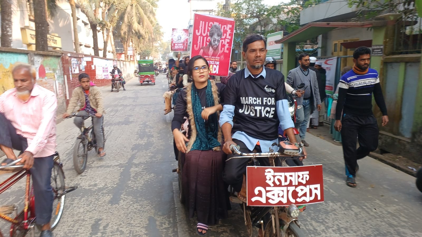 এর আগে শিল্পকলা একাডেমি প্রাঙ্গণ থেকে ‘মার্চ ফর জাস্টিস’ নামে একটি ভ্যান র্যালি বের করা হয়। র্যালিতে বিভিন্ন শিক্ষা প্রতিষ্ঠানের শিক্ষার্থী ও ইনসাফ মঞ্চের সদস্যরা অংশ নেন। বিচারের দাবিতে লেখা প্ল্যাকার্ড হাতে নিয়ে তারা শহীদ হাদী হত্যার দ্রুত বিচারের দাবিতে স্লোগান দেন। র্যালিটি শহরের গুরুত্বপূর্ণ সড়ক প্রদক্ষিণ করে একই স্থানে এসে শেষ হয়।