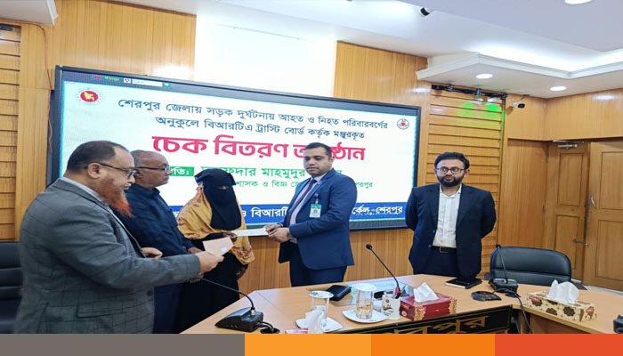 বিআরটিএ কার্যালয় সূত্রে জানা যায়, শেরপুর জেলার বিভিন্ন উপজেলায় সড়ক দুর্ঘটনায় প্রাণ হারানো ৭জন নিহতের পরিবারকে ৫লাখ করে ৩৫লাখ এবং আহত ১জনের পরিবারকে ৩লাখ টাকাসহ মোট ৮টি পরিবাকে ৩৮ লাখ টাকার চেক বিতরণ করা হয়। বিআরটিএ’র দুর্ঘটনায় ক্ষতিপূরণ সংক্রান্ত আর্থিক সহায়তা তহবিল থেকে এই চেক দেওয়া হয়।