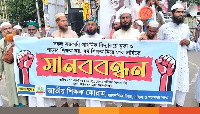 সকল সরকারী প্রাথমিক বিদ্যালয়ে নৃত্য ও গানের শিক্ষক নয়, ধর্ম শিক্ষক নিয়োগের দাবীতে জাতীয় শিক্ষক ফোরামের কেন্দ্র ঘোষিত কর্মসূচীর অংশ হিসেবে ময়মনসিংহে মানববন্ধন অনুষ্ঠিত হয়েছে।