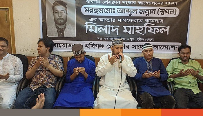 হবিগঞ্জ প্রেসক্লাব সংস্কার আন্দোলনের সদস্য সাংবাদিক মরহুম আব্দুল হান্নান স্বপনের আত্মার মাগফেরাত কামনায় দোয়া ও মিলাদ মাহফিল অনুষ্ঠিত হয়েছে। শুক্রবার (১৭ এপ্রিল) বাদ আছর হবিগঞ্জ প্রেসক্লাব প্রাঙ্গণে হবিগঞ্জ প্রেসক্লাব সংস্কার আন্দোলনের আয়োজনে এ দোয়া ও মিলাদ মাহফিল অনুষ্ঠিত হয়।