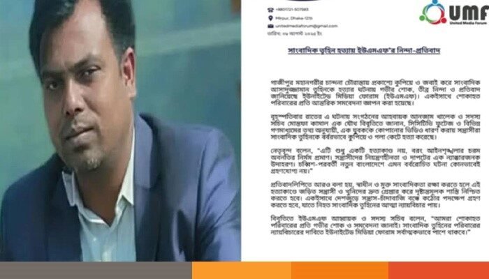 প্রতিবাদলিপিতে আরও বলা হয়, স্বাধীন ও মুক্ত সাংবাদিকতা রক্ষায় এ হত্যাকাণ্ডের সঙ্গে জড়িত সন্ত্রাসী ও খুনিদের দ্রুত গ্রেপ্তার করে দৃষ্টান্তমূলক শাস্তি নিশ্চিত করতে হবে। পাশাপাশি, দেশজুড়ে সন্ত্রাস ও চাঁদাবাজি বন্ধে কঠোর পদক্ষেপ গ্রহণের দাবি জানায় ইউএমএফ, যাতে নিহত সাংবাদিক তুহিনের আত্মা ন্যায়বিচার পায়।