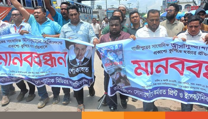 গাজীপুরে প্রকাশ্যে সাংবাদিক আসাদুজ্জামান তুহিনকে কুপিয়ে হত্যার প্রতিবাদে ঢাকা-চট্টগ্রাম মহাসড়কের পাশে নারায়ণগঞ্জের সোনারগাঁও মোগরাপাড়া চৌরাস্তা জামে মসজিদের সামনে হত্যায় জড়িতদের ফাঁসির দাবীতে মানববন্ধন ও বিক্ষোভ মিছিল অনুষ্ঠিত হয়েছে।