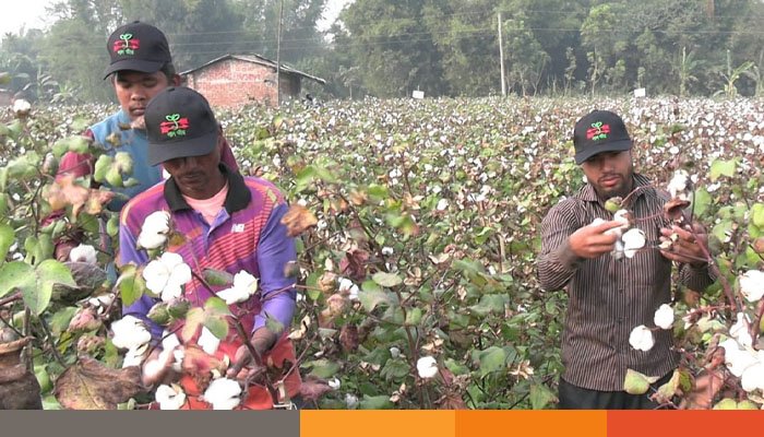 ঠাকুরগাঁওয়ে সাদা সোনার হাসি। হাইব্রীড ডিএম-৪ জাতের তুলার ফলনে খুশি কৃষকরা, বাড়ছে আবাদ। দেশের বস্ত্র খাতে তুলার ক্রমবর্ধমান চাহিদা মেটাতে সরকারি উদ্যোগের পাশাপাশি বেসরকারি প্রতিষ্ঠানও এগিয়ে এসেছে। উন্নতমানের বীজ সরবরাহ ও মাঠ পর্যায়ে পরামর্শ দেওয়ার মাধ্যমে কৃষকদের তুলা চাষে উদ্বুদ্ধ করা হচ্ছে। এরই ধারাবাহিকতায় ঠাকুরগাঁও জেলায় এবার হাইব্রীড ডিএম-৪ জাতের তুলার চাষ করে খরচের তুলনায় প্রায় দ্বিগুণ লাভবান হচ্ছেন চাষিরা।