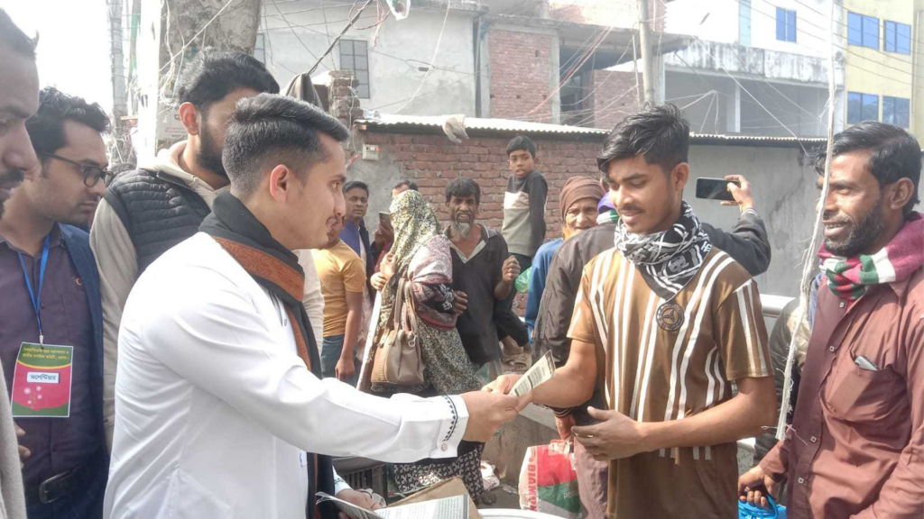 ভোলা বাংলা স্কুল মোড় সদর রোড ও নতুন বাজার এলাকায় ঘোষণা পত্রে ৭ দফা দাবিতে লিফলেট বিতরণ করছেন জুলাই শহীদ স্মৃতি ফাউন্ডেশনের সাধারণ সম্পাদক সারজিস আলম
