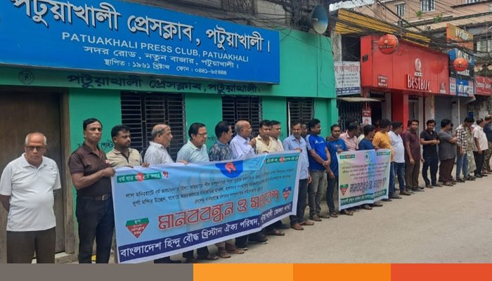 রবিবার (২৯ জুন) সকালে পটুয়াখালী প্রেসক্লাব চত্বরে আয়োজিত ঘণ্টাব্যাপী এই মানববন্ধনে বিভিন্ন স্তরের সনাতন ধর্মাবলম্বীরা অংশগ্রহণ করেন।