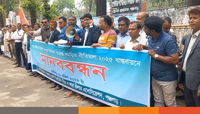 সার ডিলার নিয়োগ ও সার বিতরন সংক্রান্ত সমন্বিত নীতিমালা বাস্তবায়নের দাবীতে পঞ্চগড়ে মানববন্ধন করেন বিএডিসি বীজ ও সার ডিলার এসোসিয়েশন।