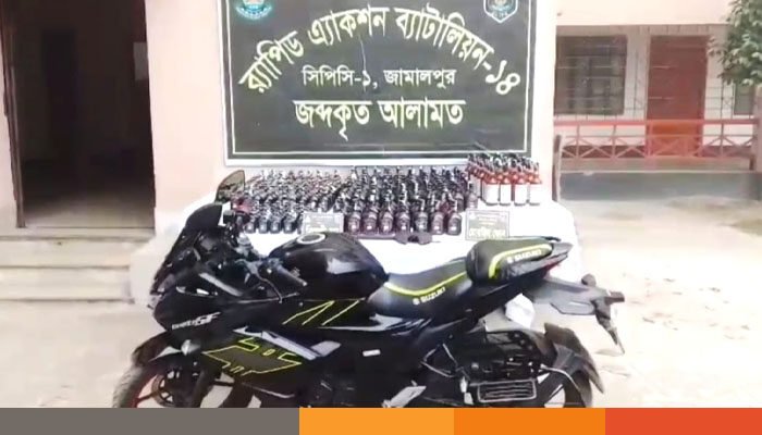 জামালপুর র‌্যাব-১৪ এর অভিযানে সীমান্ত এলাকা থেকে বিপুল পরিমাণ বিদেশি মদ, একটি চাইনিজ কুড়াল ও একটি মোটরসাইকেল সহ ২ জনকে আটক করা হয়েছে।