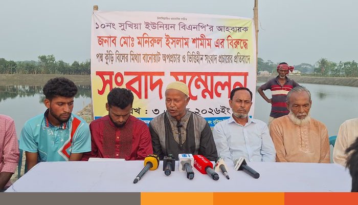 কিশোরগঞ্জের পাকুন্দিয়া উপজেলার ১০নং সুখিয়া ইউনিয়ন বিএনপির আহবায়ক মোঃ মনিরুল ইসলাম শামীমের বিরুদ্ধে ‘পদ্ম কুড়ি বিল’ নিয়ে মিথ্যা ও বানোয়াট অপপ্রচার এবং ভিত্তিহীন সংবাদ প্রচারের প্রতিবাদে এক সংবাদ সম্মেলন অনুষ্ঠিত হয়েছে। আজ শুক্রবার (৩ এপ্রিল) বিকেলে স্থানীয় একটি জলাশয় সংলগ্ন এলাকায় এই সংবাদ সম্মেলন আয়োজন করা হয়।