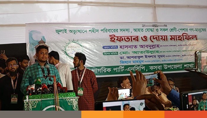 আজ সোমবার বিকেলে ব্রাহ্মণবাড়িয়ার কসবার মহিলা কলেজ মাঠে জুলাই অভ্যুত্থানে শহিদ পরিবারের সদস্য, আহত যোদ্ধা ও বিভিন্ন শ্রেণি-পেশার মানুষের সম্মানে ইফতার মাহফিলে এসব কথা বলেন হাসনাত আব্দুল্লাহ।