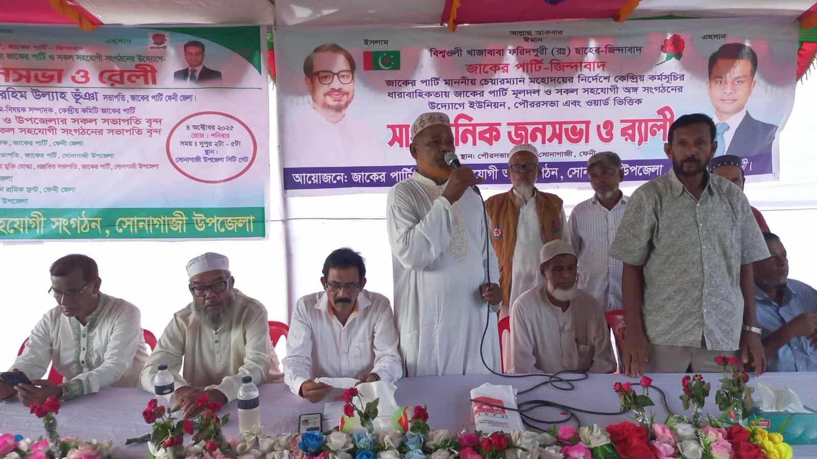 ফেনীর সোনাগাজীতে জাকের পার্টির উদ্যোগে আসন্ন জাতীয় সংসদ নির্বাচন উপলক্ষে কেন্দ্রীয় কর্মসূচির অংশ হিসেবে জাকের পার্টি ও সহযোগী সংগঠনের আয়োজনে সাংগঠনিক জনসভা ও র্যালি ৪ অক্টোবর (শনিবার) বিকেলে উপজেলার সিটি গেইট সংলগ্ন স্থানে অনুষ্ঠিত হয়।