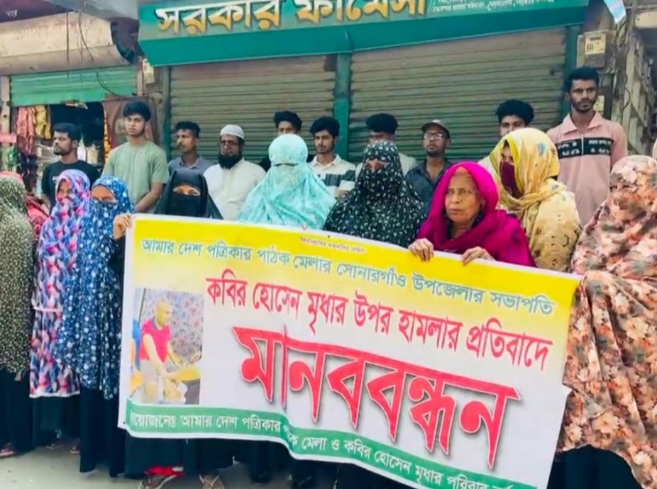 নারায়ণগঞ্জের সোনারগাঁয়ে নোয়াগাঁও ইউনিয়নের পরিবার পরিকল্পনা পরিদর্শক কবির হোসেন মৃধার উপর সন্ত্রাসী হামলার প্রতিবাদে মানববন্ধন করেছেন এলাকাবাসী।