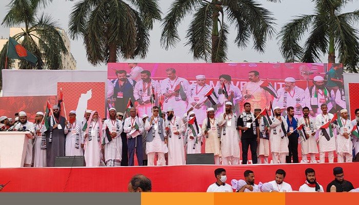 এদিকে, সকাল থেকেই রাজধানীর বিভিন্ন স্থান থেকে মিছিল নিয়ে সোহরাওয়ার্দী উদ্যানে আসতে শুরু করে মানুষ। মিছিলগুলোর কোনোটি শাহবাগ, কোনোটি দোয়েল চত্ত্বর, নীলক্ষেতের দিক থেকে উদ্যানে মিলিত হতে দেখা যায়। বেশিরভাগ মানুষের হাতে শোভা পাচ্ছে বাংলাদেশ ও ফিলিস্তিনের পতাকা।