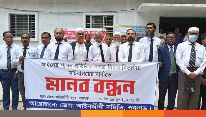 আইনের শাসন প্রতিষ্ঠা এবং বিচার বিভাগের স্বাধীনতা নিশ্চিত করার লক্ষ্যে স্বতন্ত্র বিচার বিভাগীয় সচিবালয় গঠনের দাবিতে পঞ্চগড়ে মানববন্ধন কর্মসূচি পালন করেছেন আইনজীবীরা।
