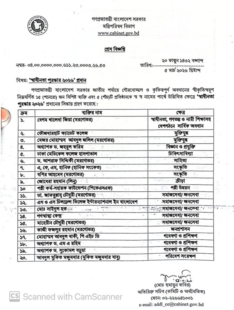 মন্ত্রিপরিষদ বিভাগের অতিরিক্ত সচিব (কমিটি ও অর্থনৈতিক) হুমায়ুন কবিরের সই করা ওই বিজ্ঞপ্তিতে বলা হয়, গণপ্রজাতন্ত্রী বাংলাদেশ সরকার জাতীয় পর্যায়ে গৌরবোজ্জ্বল ও কৃতিত্বপূর্ণ অবদানের স্বীকৃতিস্বরূপ ১৫ জন বিশিষ্ট ব্যক্তি এবং ৫টি প্রতিষ্ঠানকে স্ব স্ব নামের পার্শ্বে উল্লিখিত ক্ষেত্রে ‘স্বাধীনতা পুরস্কার ২০২৬’ প্রদানের সিদ্ধান্ত নেয়া হয়েছে।