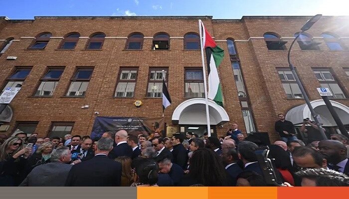 ফিলিস্তিনি রাষ্ট্রকে স্বীকৃতি দেয়ার একদিন পর, লন্ডনে দূতাবাসের বাইরে ফিলিস্তিনি পতাকা উত্তেলন করা হয়েছে। যা ব্রিটেনের ঐতিহাসিক এবং দীর্ঘ প্রতীক্ষিত ফিলিস্তিনি রাষ্ট্রের স্বীকৃতির প্রতীক।