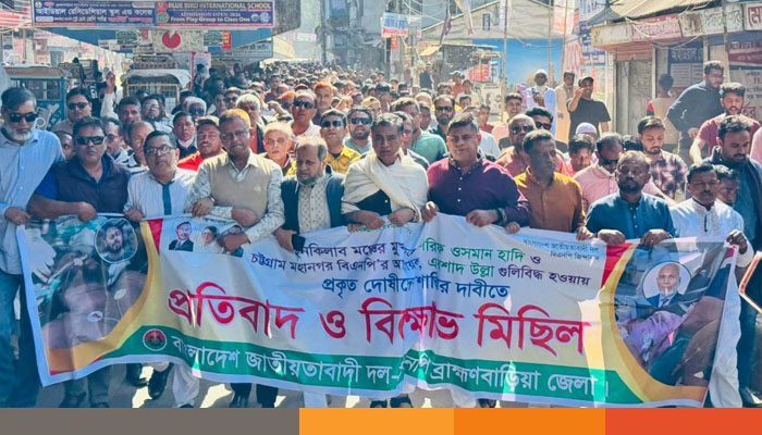 রাজধানীতে ইনকিলাব মঞ্চের মুখপাত্র শরীফ ওসমান হাদি ও চট্টগ্রাম মহানগর বিএনপির আহ্বায়ক এরশাদ উল্লাহ গুলিবিদ্ধের ঘটনায় ব্রাহ্মণবাড়িয়ায় বিক্ষোভ মিছিল ও প্রতিবাদ সভা অনুষ্ঠিত হয়েছে।