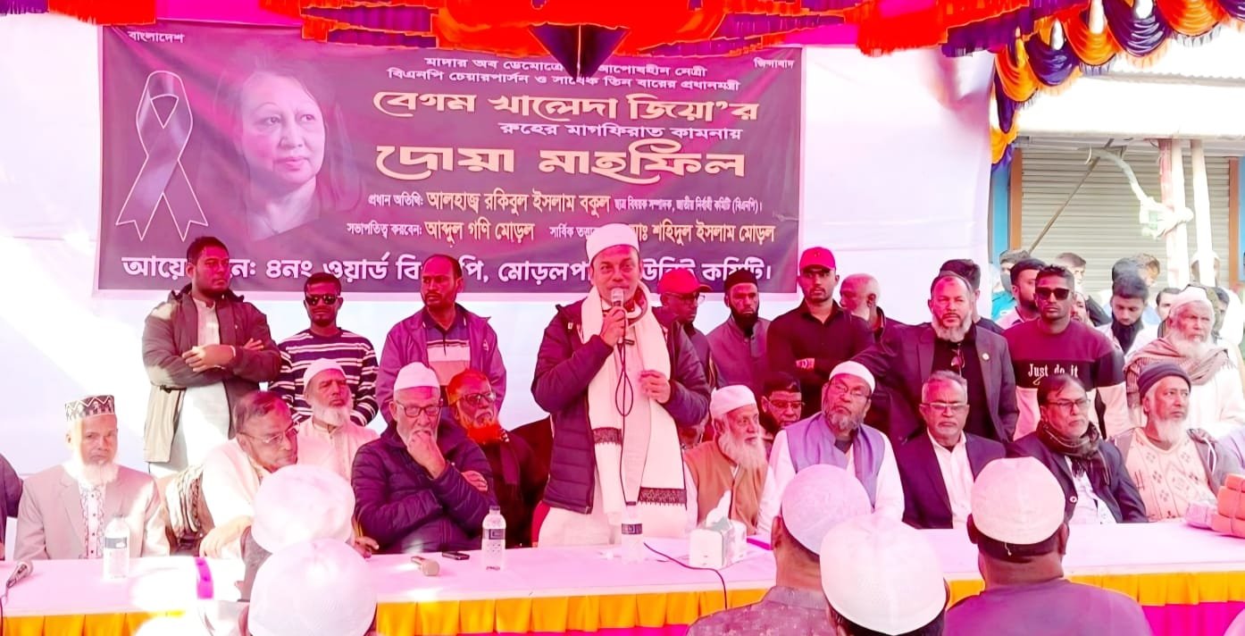 আলোচনা সভা শেষে মরহুমা বেগম খালেদা জিয়ার রুহের মাগফেরাত কামনায় বিশেষ দোয়া ও মোনাজাত পরিচালনা করেন হাফেজ আলমগীর হোসেন।