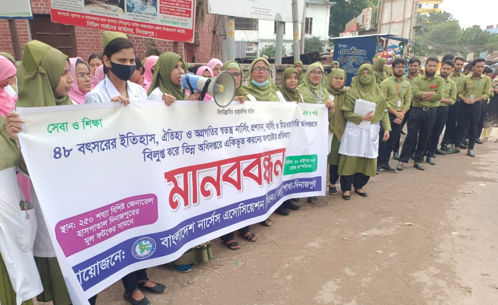 অপরদিকে একই দাবিতে একই সময়ে সিভিল সার্জন কার্যালয়ের সামনে ২৫০ শয্যাবিশিষ্ট দিনাজপুর জেনারেল হাসপাতালের নার্সিং কর্মকর্তা ও দিনাজপুর নার্সিং কলেজের শিক্ষক-শিক্ষার্থীরা মানবন্ধন কর্মসূচি পালন করেছে।