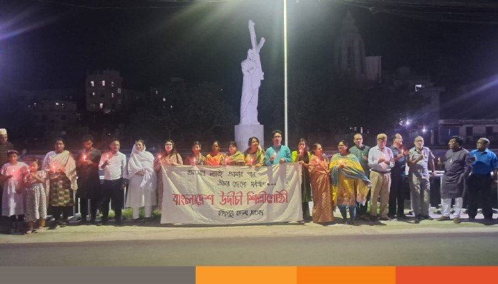 মঙ্গলবার রাতে সংগঠনটির ব্যণারে মোমবাতি হাতে নিয়ে এই প্রদীপ প্রোজ্জ্বলন করা হয়। যার ব্যণারে লেখা ছিলো ‘আমার লড়াই আমার গান-উঠবে জেগে সর্বপ্রাণ’।